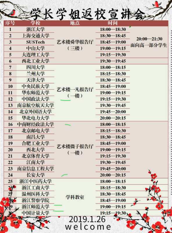 两位同学均毕业于浙江省桐庐中学,该校自浙江省高考改革以来就非常注重向高三学子们宣传各大高校的基本情况以及招生政策,同时也十分支持已毕业的学子们进行寒假实践活动,因此早在2018年的12月24日,浙江省桐庐中学就选定了此次返乡宣讲活动的总负责人,并且建立了“回访母校计划负责人”qq交流群,以便于及时发布消息与联系沟通。在此次活动中,有来自30所高校的学生团队进行宣讲,经过讨论与协商,学校最终确定于2019年1月26日18时在学校报告厅开展返乡宣讲活动。来自金年会诚信信誉至上的“西北偏北”宣讲队被安排于26日晚七点开展宣讲。