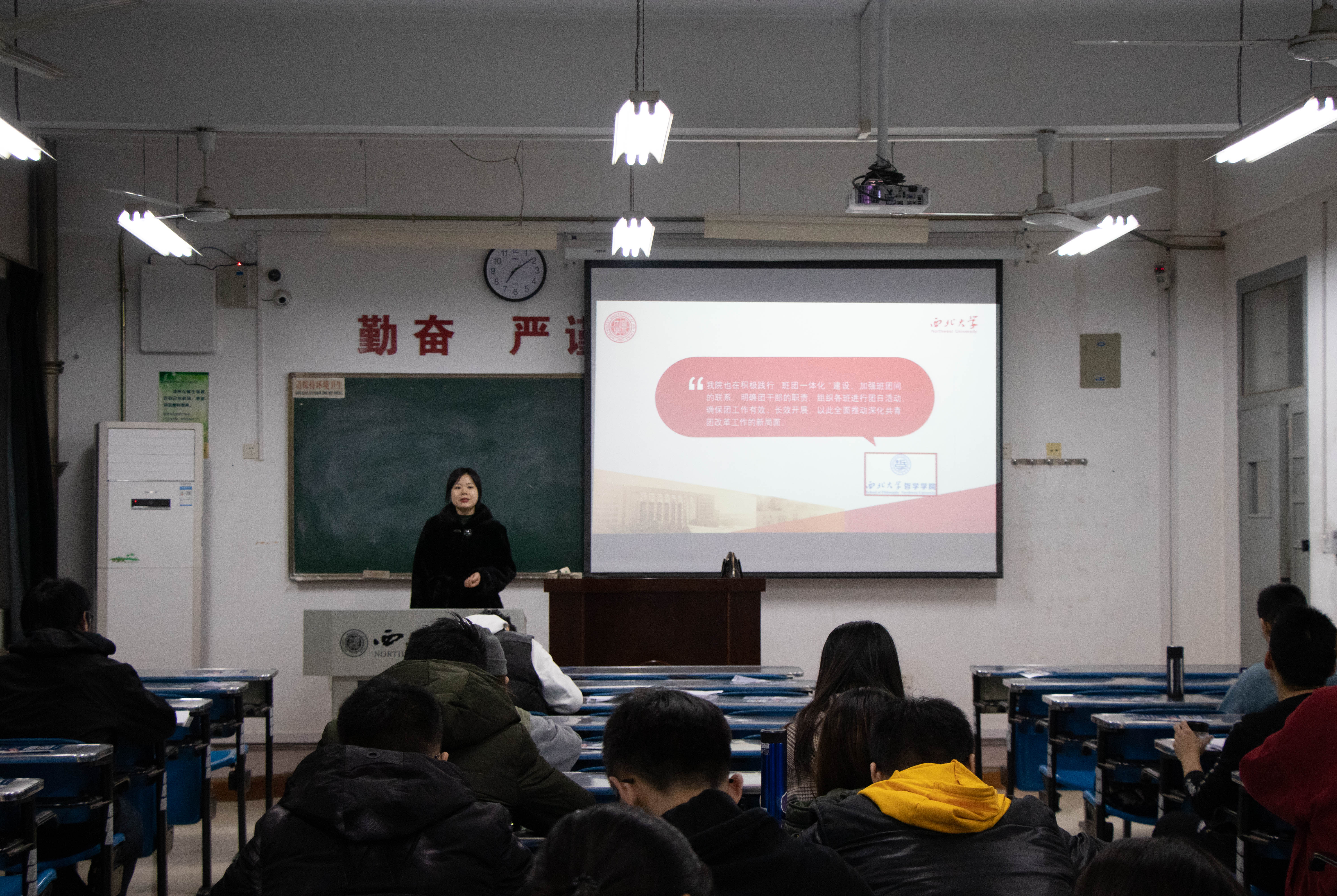 2019年12月17日晚,金年会jinnianhuicom本科2018级哲学与社会工作团支部在1205教室召开了“班团一体化政策学习”主题团课,邀请到院团委书记李鑫老师为大家上团课。本次团课旨在促进团支部的凝聚力,引导同学们进一步深入了解“班团一体化”,积极投身“班团一体化建设”