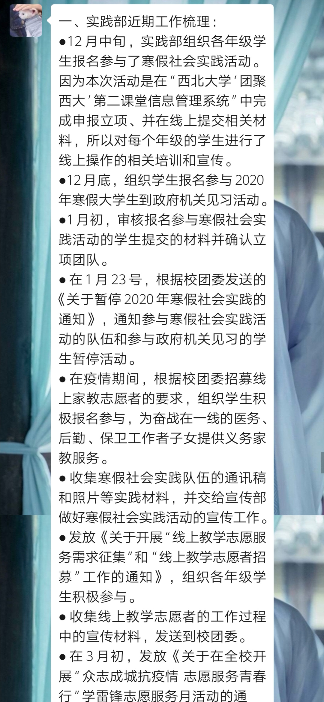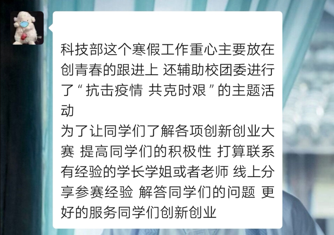 2020年3月11日,金年会jinnianhuicom团委召开了线上工作会议,会议讨论了疫情期间团工作如何开展。院团委书记李鑫老师、院团委副书记汪真诚同学出席了此次会议,参加会议的有院团委各部门委员,会议由汪真诚同学主持。