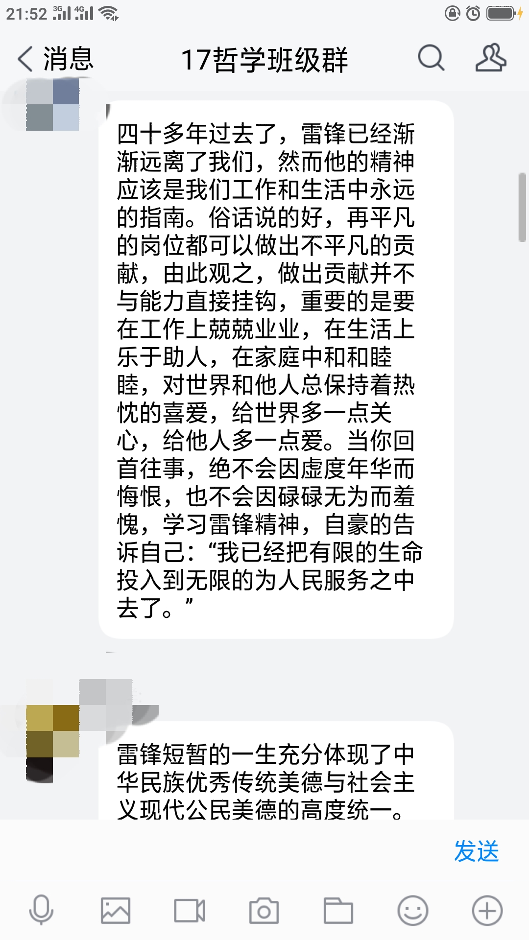 3月18日晚8点,本科2017级社会工作团支部组织召开了“学习雷锋精神,抗击肺炎疫情”主题团日活动。本次团日活动采用线上学习讨论会的形式,在“腾讯会议”平台进行。