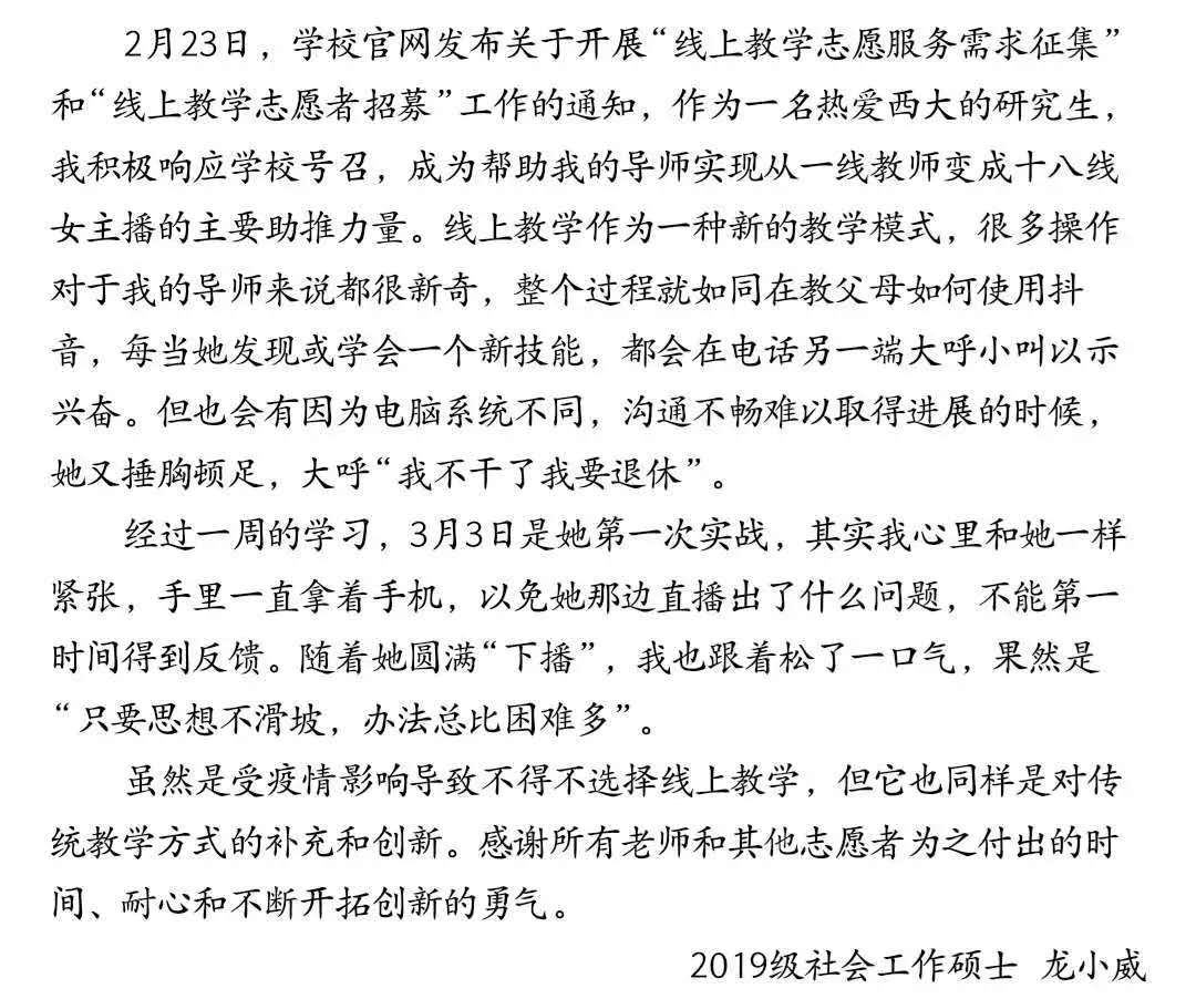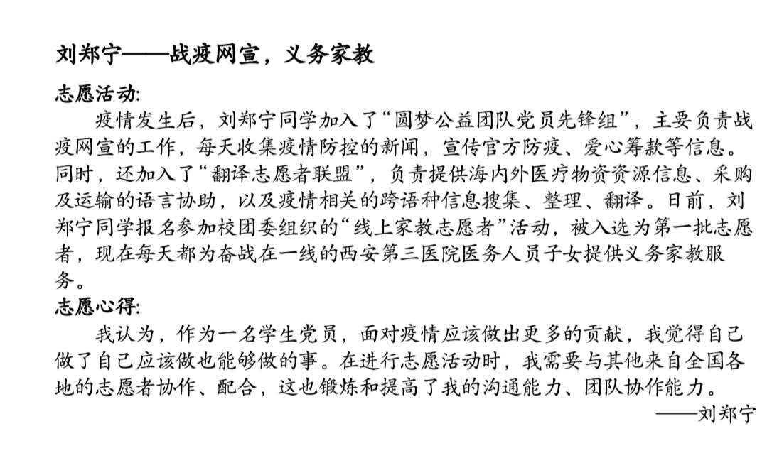疫情发生以来,金年会官网刘郑宁等多名学生积极参加了由我校团委组织的线上教学志愿服务活动,他们或协助老师进行线上教学,使得天南地北的同学和老师能够顺利汇聚在一起,为停课不停学提供技术保证;或为奋战在一线的西安第三医院医务人员子女提供义务家教服务,以便减轻医护人员的压力,为他们扫除后顾之忧,让他们能够以更好的状态投身抗疫战中。