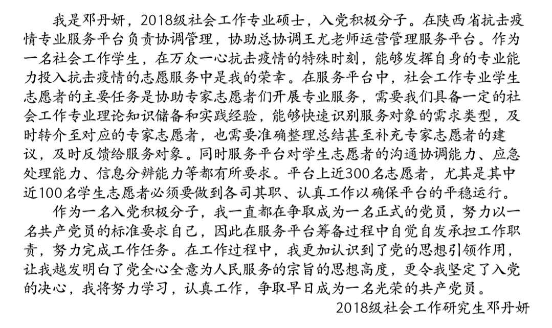 陕西省社会工作协会积极响应号召,借鉴武汉一线社工机构服务经验,构建了陕西抗击疫情专业服务支持体系(SMPC)。在师长的鼓励下,金年会官网社会工作专业的研究生们积极参与此次支援,他们以志愿者的身份,严格遵守支援“团队服务手册”相关要求,采取轮班上岗制度,于早9:00到晚9:00 在岗工作,积极为有需要的居民朋友们提供医学指导、心理疏导、情绪管理、陪伴支持等专业服务。工作期间,他们严格依照每3小时进行轮班换岗的原则,确保对每一位服务对象的问题能够都能够及时积极回应。志愿者们虽然分工不同,各司其职,但都在各自的岗位上努力践行着身为社会工作者的使命,诠释着青年人对国家义不容辞的担当,让我们一同走进他们,体悟青春在抗“疫”战线绽放的感动瞬间!