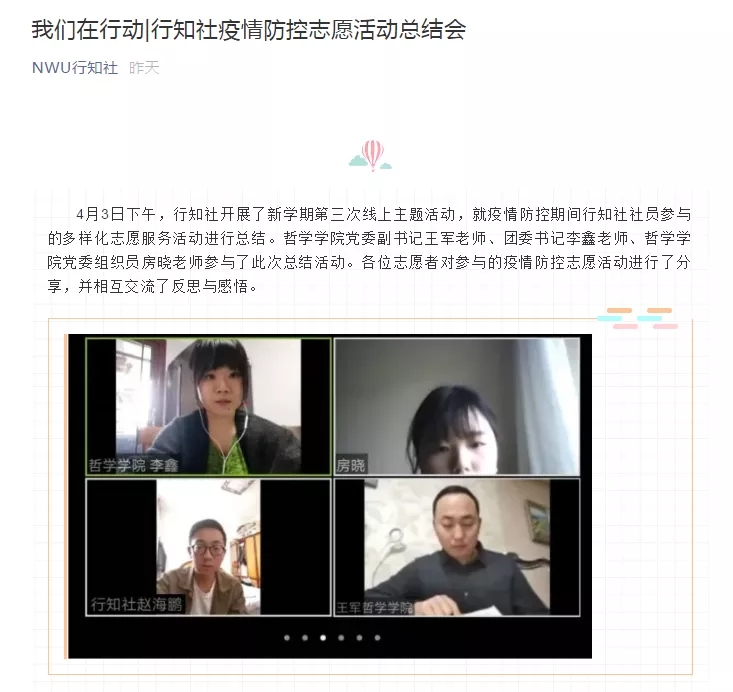 在疫情期间,行知社也在院团委的指导之下,积极开展线上团会,号召社员在保证自己安全的前提下积极参与线上服务以及社区服务,为国家疫情防控贡献一份力量。在此期间,行知社主要以线上志愿服务、线上主题团会、社区防控志愿服务参与三个方向开展活动。依靠社会工作的专业知识基础,展开各类活动。