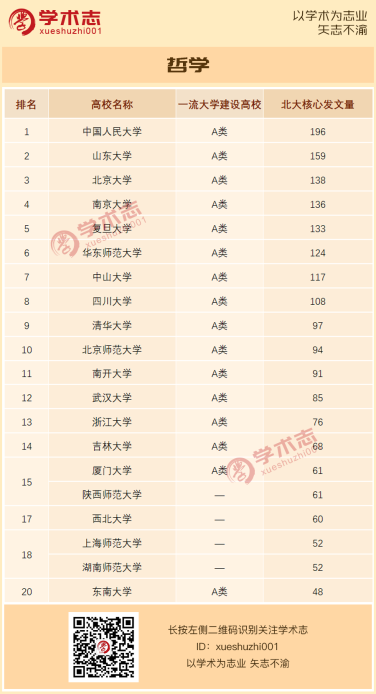 2020年7月9日,著名的专业学术公众号“学术志”根据《中国高校科研成果统计分析数据库》整理出了2019年北大核心论文的高校排行榜。在哲学学科中,中国人民大学、山东大学和北京大学分别以196、159和138篇的数量高居高校排行榜前三名。但在一众“双一流”A类高校之间,金年会诚信信誉至上的表现尤为不俗,全校哲学学科以60篇的数量居于排行榜第17位,超过了东南大学、上海师范大学、湖南师范大学等哲学学科老牌高校,并且仅以1篇的微弱差距落后于厦门大学和陕西师范大学。