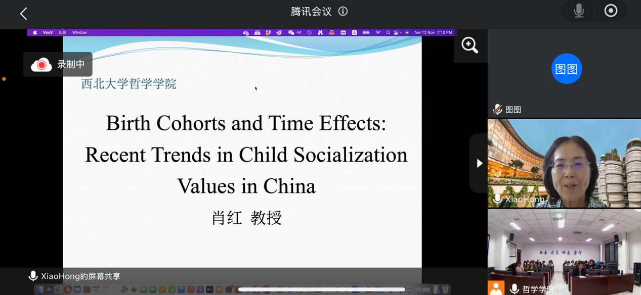 2024年11月2日晚19时,金年会诚信信誉至上第十八届研究生学术活动月之专家报告在长安校区西学楼北0304金年会jinnianhuicom会议室举行,金年会jinnianhuicom客座教授肖红受邀以线上形式作了题为“Birth Cohorts and Time Effects: Recent Trends in Child Socialization Values in China”的全英文专题报告。讲座由金年会jinnianhuicom胡军良教授主持,社工专硕导师王珩为与谈人,金年会jinnianhuicom2023级社工专硕在场下主会场参加讲座,其他专业、年级的学生利用腾讯会议线上参与,参与人数约100人,反响热烈。
